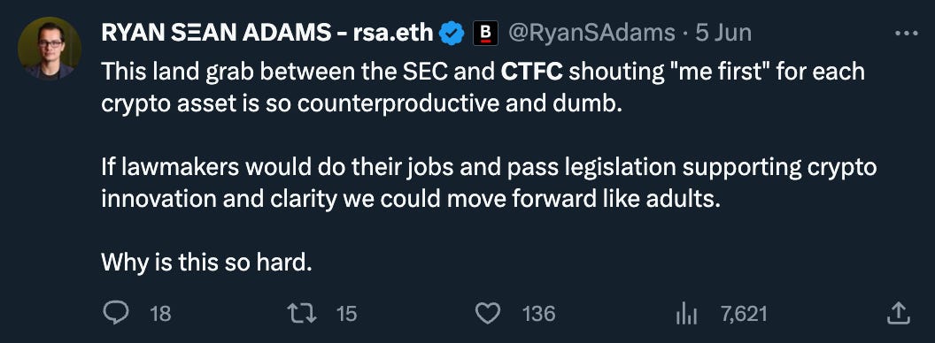 As BTC hovers below $30k for another week, with a possible test of $27k later in August, let’s put the markets aside and talk about crypto regulation. In particular, let’s understand the key US regulators and legal actors - because they do influence prices.