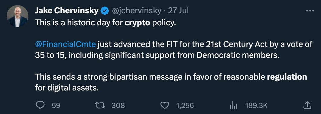 And it’s not only this Financial Innovation and Technology for the 21st Century Act that is moving towards a floor vote, but also the Clarity for Payment Stablecoins Act and the Blockchain Regulatory Certainty Act. Isn’t it great news?
