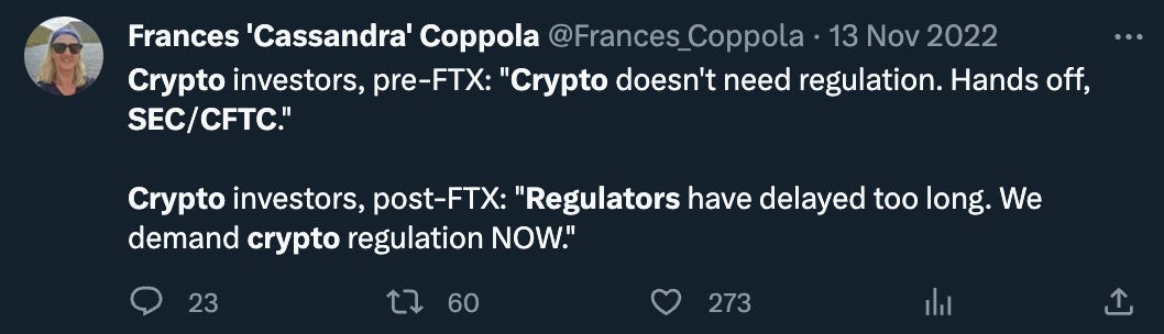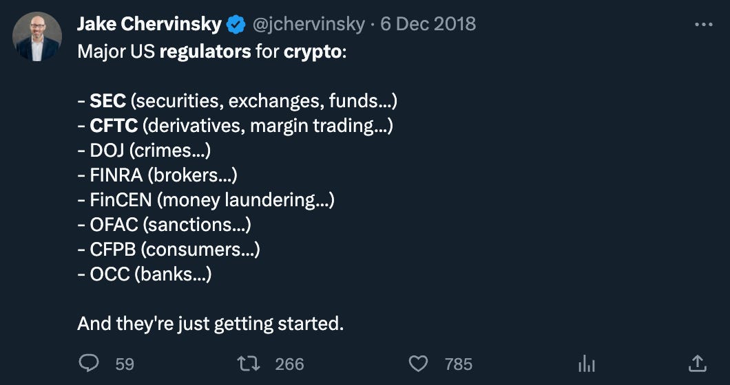Back in 2018, Jake Chervinsky was right. But in 2023 we must add congressional committees to the plethora of major US regulators following the demise of Terra, Celsius and FTX. And, internationally, we can’t forget the US-dominated FATF.