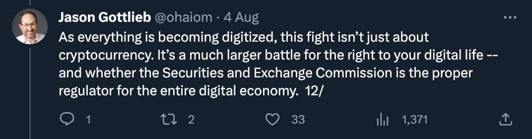 I believe so, as crypto’s impact will be significantly larger once there’s regulatory clarity around it. And even if you prefer a more marginal crypto economy, at least it’s clear that this ambiguity harms the US. Has it definitely lost the race, though?